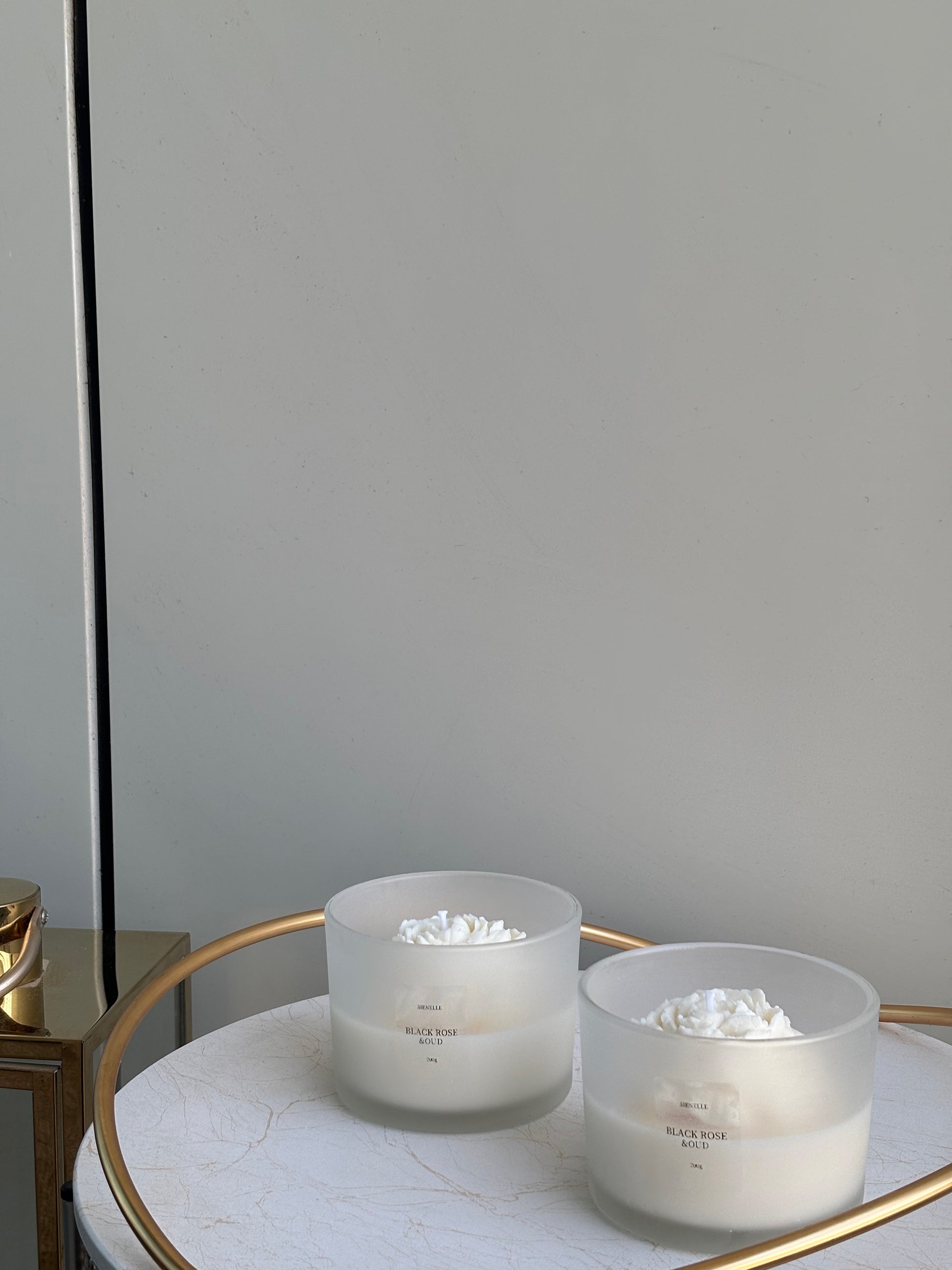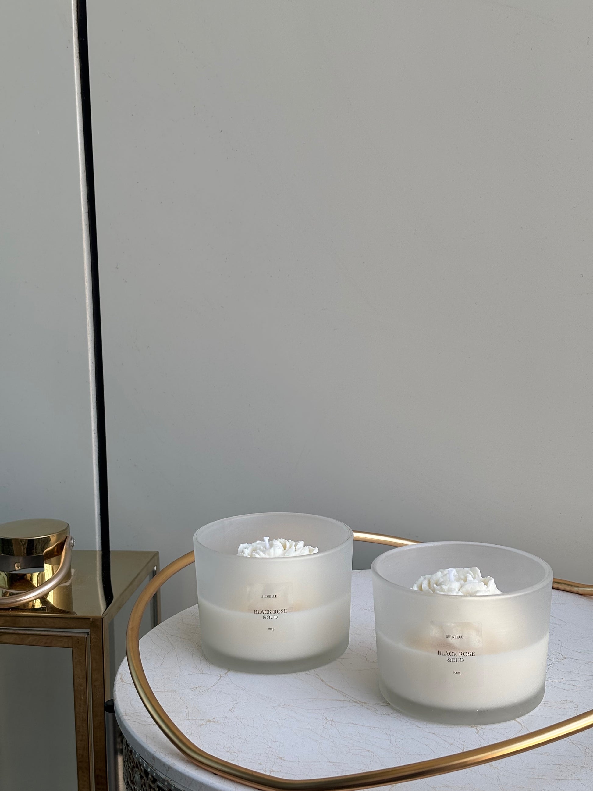 Velvet Oud blends the deep allure of black rose with the rich warmth of oud wood, creating a fragrance that feels both sensual and serene. Hand-poured in a frosted glass vessel, this candle embodies understated elegance — smooth, creamy, and timelessly refined.